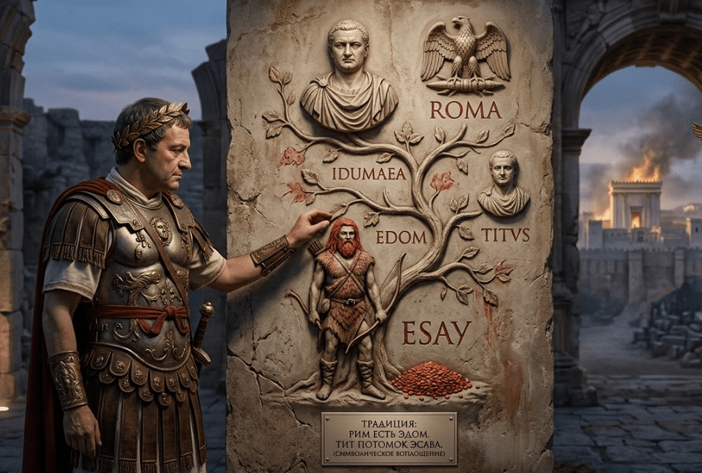 Да, с точки зрения еврейской традиции это утверждение совершенно верно. Чтобы проследить эту связь, нужно обратиться к тому, как наши мудрецы рассматривают историю народов. Согласно Торе, от Эсава произошел народ Эдом, как прямо сказано в книге Брейшит: «Эсав, он же Эдом». В свою очередь, в талмудической и мидрашистской литературе Римская империя традиционно идентифицируется именно с Эдомом. Наши мудрецы видели в Риме прямое духовное и национальное продолжение линии Эсава. Соответственно Тит, разрушивший Второй Храм в Иерусалиме, действовал как вождь и истинное лицо Римской империи, в полной мере воплощая в себе эту историческую преемственность.