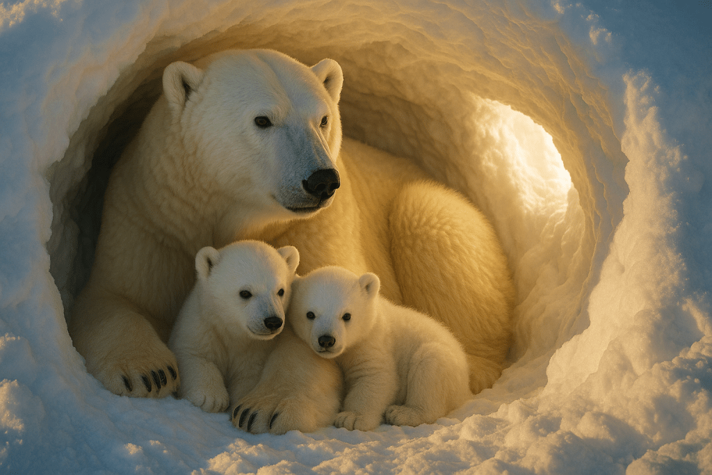 Белые медведицы рожают в разгар полярной зимы, в берлоге под снегом, когда температура опускается до -40 градусов. Удивительно, но после рождения медвежат мать остается с ними в берлоге от трех до четырех месяцев, не выходя наружу и не питаясь все это время. Она живет исключительно за счет накопленных жировых запасов, выкармливая медвежат молоком.