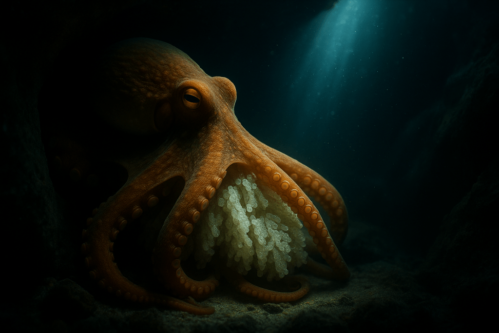 Самка осьминога демонстрирует, пожалуй, самый драматичный пример материнского самопожертвования во всем животном мире. После откладывания яиц – а их может быть от 50 до 200 тысяч – она начинает непрерывную вахту, которая продлится от нескольких месяцев до года, в зависимости от вида.