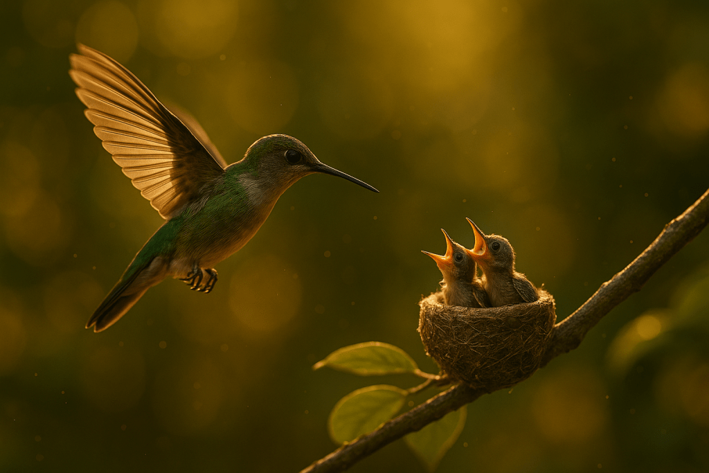 Колибри – одна из самых маленьких птиц в мире, и ее материнская забота поражает своей тщательностью. Самка колибри строит гнездо размером с наперсток из растительного пуха, паутины и лишайника. Это архитектурное чудо может растягиваться по мере роста птенцов, сохраняя при этом свою прочность.