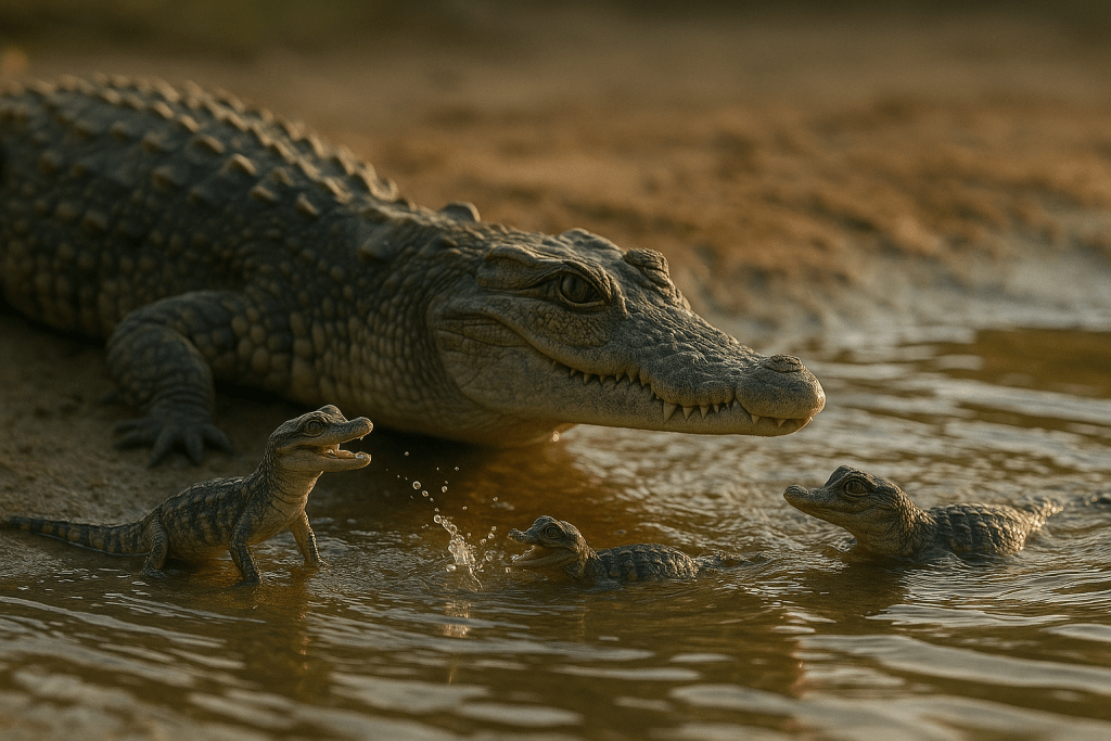Крокодилы имеют репутацию свирепых хищников, но самки крокодилов проявляют удивительную нежность к своему потомству. После откладывания яиц мать охраняет гнездо от хищников в течение трех месяцев. Когда приходит время вылупления, она слышит писк детенышей изнутри яиц и осторожно раскапывает гнездо.