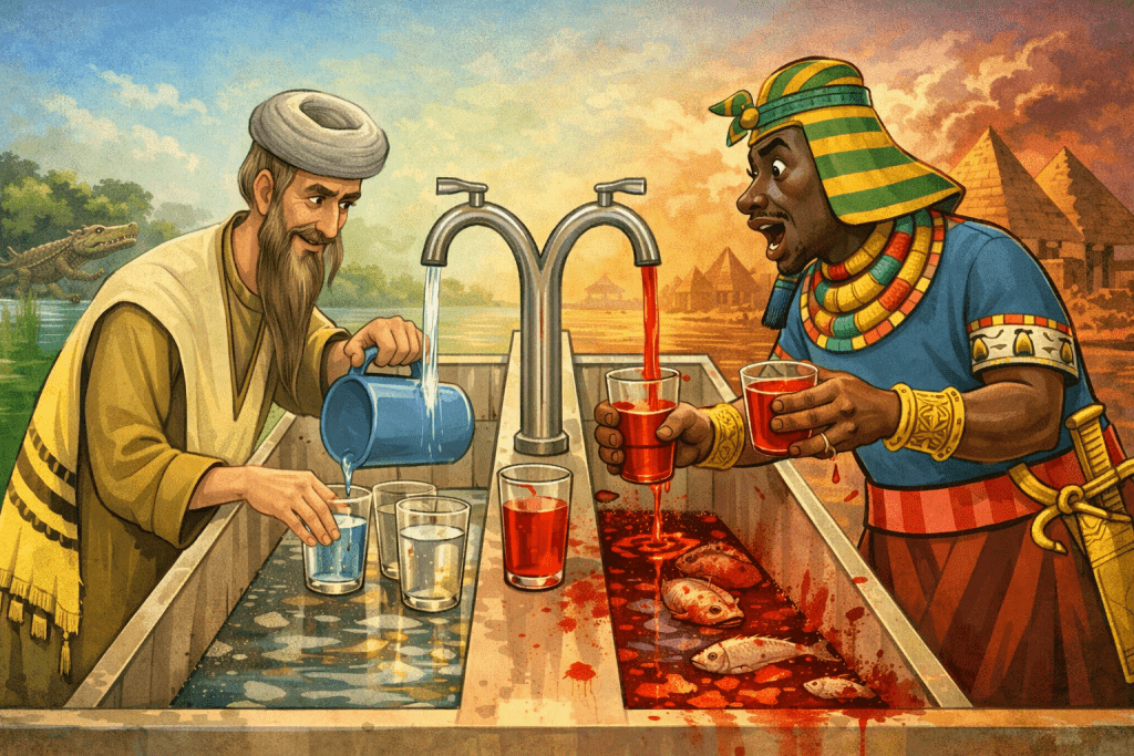 В начале река превратилась в кровь, и рыба в ней умерла. Река для Египта означала жизнь – это была вода для питья и орошения. В добавок, она доставляла им рыбу – основную животную пищу. Ведь скот был для египтян объектом поклонения, и его не ели. Но главное, египтяне гордились Нилом, потому что он поднимался и сам орошал поля без усилий со стороны человека. Нил был богом египтян, и вот он превратился в кровь, оставив их в смятении и бессилии.