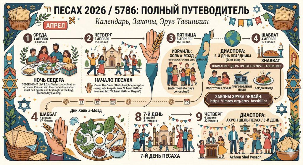 Праздник Песах уже на пороге, и подготовка к нему идет полным ходом. В этом году, 5786 по еврейскому календарю (2026 год по григорианскому), расписание праздничных дней создает интересную структуру, на которую важно обратить внимание — особенно нашим читателям, находящимся в диаспоре (за пределами Израиля).
